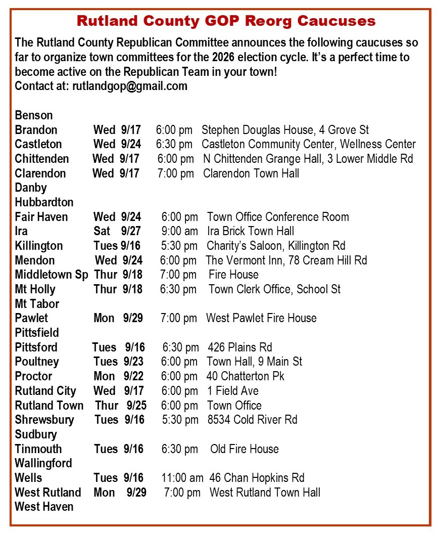 September is CAUCUS month for town/city GOP committees! At these caucuses, town committee will define their membership lists, elect their officers who will serve for the next 2 years, and elect delegates to represent them on the Rutland County Republican Committee! This is the GRASSROOTS of our Vermont Republican Party. On October 16th, town delegates will meet to reorganize the county Republican Committee, then on Nov 8 the state committee reorganizes.